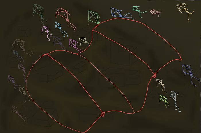 Fighter Kites sketch: thinner house lines, detailed kites, ribbons, and stitched designs.