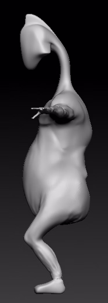 After showing my group and professors, we came to the conclusion that the wider hips with the light bulb shape was preferable for the front and to keep the bean shape and big tummy of the side, experimenting with the size and proportions. I was advised to move the legs and neck/head back so they're closer and over the body. I was advised to curve the side profile more and change the fit look of the shoulders and chest. Once I figure the body proportions out, I'll figure out the skin and muscles of the neck as well as sorting out the face.