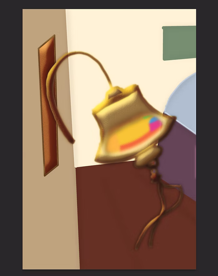 Today I was focused on finishing up a rough draft of the opening image. Using the sketch I created last work day, I colored and added details. It took me a bit longer because, although stylized and not realistic, I wanted the metal to be recognized as gold, which is something I learned during the process with the layer style settings. I also experimented a lot with the concept of the reflection, playing around with the imagery and depth. I was originally going to take the colors from the original room and make them plain neon, but when I did that it didn't look right. That is when I looked up different references we had collected and tried using gradients and blending which yielded a much better result. I discussed with my group and they helped with the idea of adding sound wave distortion to show that the bell was ringing. I changed the position of the rope or chain hanging off of the belt and added the distortion to the reflection which helped with the effect. Getting the effect on the bell was the most challenging part, adding warping, distortion, a slight white glow on the outside rim, and blurring and smudging the image helped the process, but it was very difficult to figure out what would work and what didn't. In the end, for a rough draft, I think it turned out very well.
