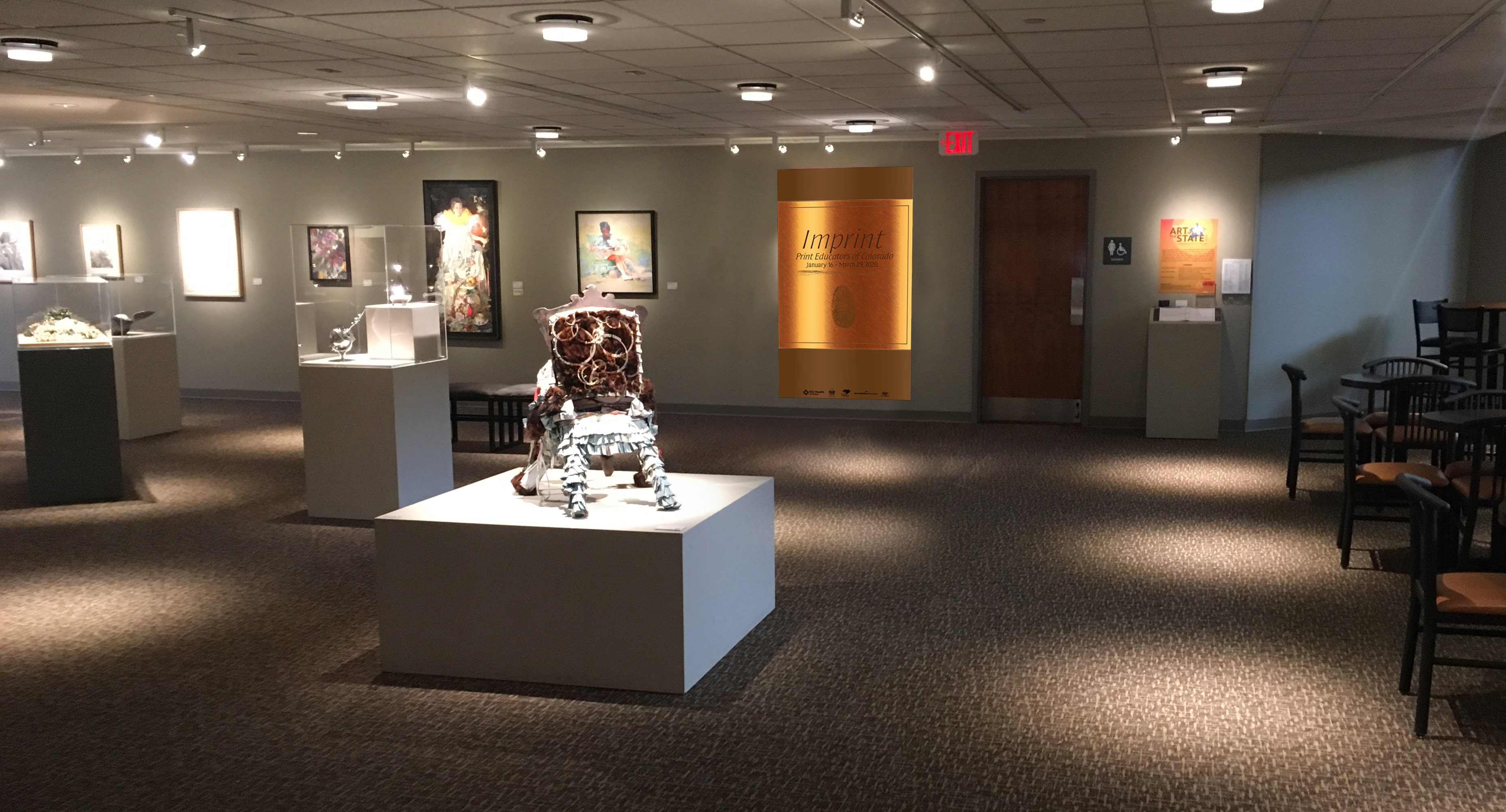 I collaborated on two mural sets for the Arvada Center, each tied to different exhibitions. For the first, based on printmaking, my partner and I designed three murals: one inspired by a printing press for the main gallery, and two for the upper and theater galleries featuring fingerprints and metal plate printing techniques.